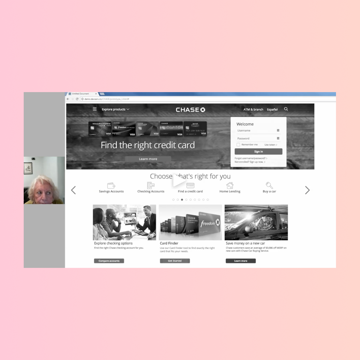 User testing for Chase’s card finder prototypes, comparing three possible prototypes to qualify strengths and weaknesses of each